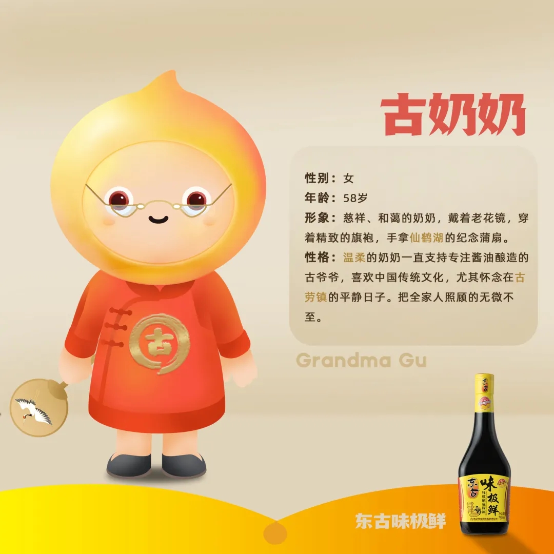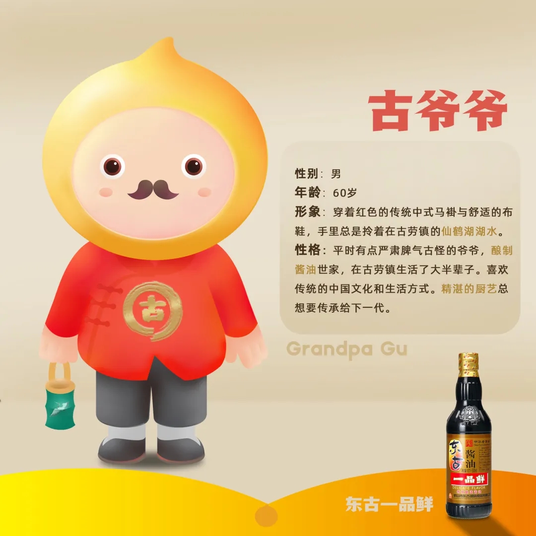 首先,隆重登場(chǎng)的是我們的古爺爺,穿著紅色的中式馬褂,拎著古勞鎮(zhèn)的仙鶴湖湖水,喜愛(ài)中國(guó)傳統(tǒng)文化,作為釀制醬油世家,嚴(yán)肅與嚴(yán)謹(jǐn)是他的代名詞。