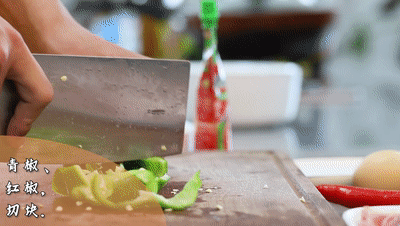 ● 青紅椒切塊、菠蘿切塊放入碗中,倒入鹽水浸泡一下(菠蘿在市場(chǎng)買的時(shí)候,老板直接幫我把皮都去了,真方便)