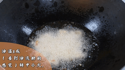 ● 熱鍋燒油,油溫8成(能看到油有流動(dòng)的感覺)轉(zhuǎn)中小火、放入豬肉粒,炸至表面微黃撈出,再轉(zhuǎn)大火復(fù)炸,炸至黃金撈出控油