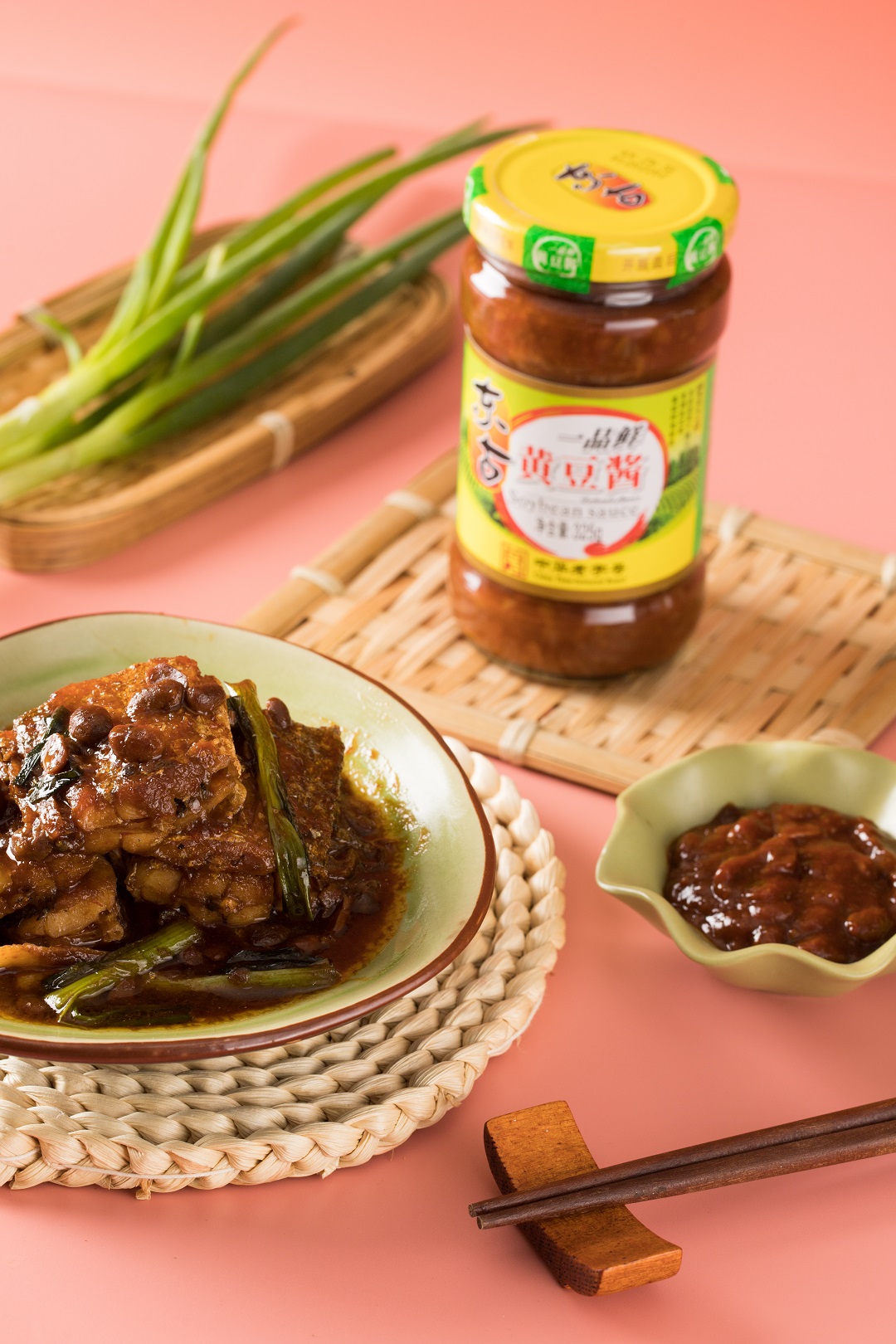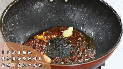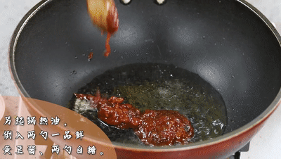 另起鍋熱油,倒入兩勺東古一品鮮黃豆醬、兩勺白糖,小火把白糖融化掉