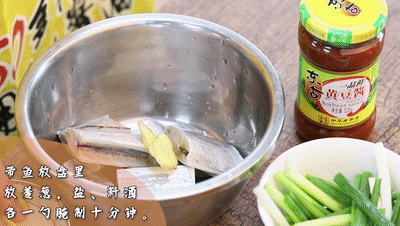 帶魚放盤里放入姜、蔥、一勺鹽、一勺料酒腌制十分鐘