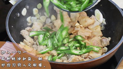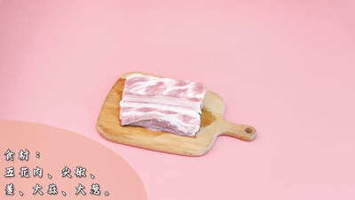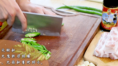 尖椒和大蔥斜刀切圈、大蒜和姜塊切小、五花肉切薄片