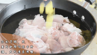 豬蹄冷水下鍋,放入姜片和兩勺東古料酒,大火煮至沸騰,再煮20分鐘,撈出放入冰水中備用,煮完豬蹄的高湯別倒一會有用。