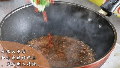 倒入香菜和小米辣炒斷生,關(guān)火倒入豬蹄,攪拌均勻讓每塊豬蹄都蘸上料汁即可