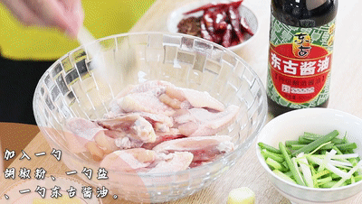 切好的雞翅加入一勺胡椒粉、一勺東古醬油、一勺東古料酒、一勺東古蠔油、一勺鹽抓拌均勻