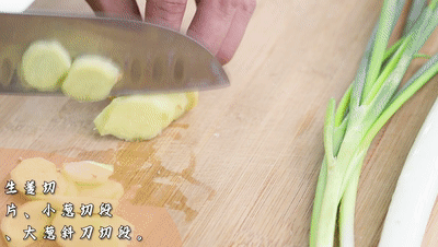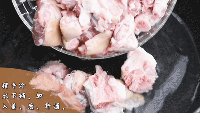 豬手冷水下鍋,加入姜、蔥、料酒,燒至水沸,再煮兩分鐘撈出備用