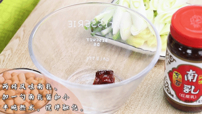 碗里放入兩磚東古風(fēng)味南乳、加入一勺南乳醬和小半碗熱水,把南乳攪拌融化