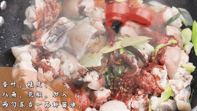 豬手翻炒兩下、再倒入調(diào)好的南乳汁、香葉、桂皮、八角、花椒。