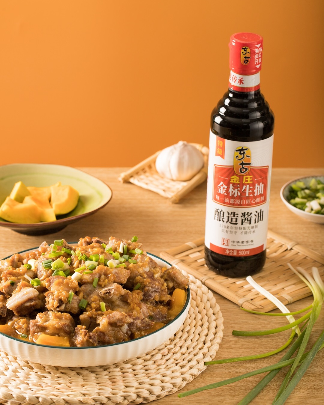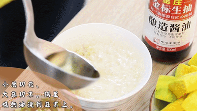 鍋里燒熱油澆到蒜末上,再加入一勺鹽和白糖,一勺東古金莊金標生抽,一勺東古蠔油攪拌均勻。