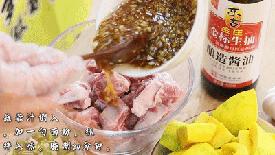 把蒜蓉汁倒入排骨中,加入一勺面粉。抓拌入味,腌制20分鐘。