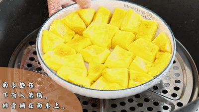 南瓜墊在下面入蒸鍋,排骨鋪在南瓜上。水開大火蒸20分鐘即可。