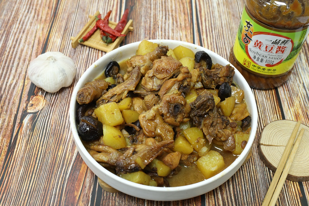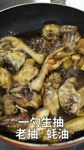 加入東古一品鮮黃豆醬,東古紅燒醬油,東古蠔油,東古一品鮮醬油翻炒均勻。再加入一勺鹽,一碗清水燉20分鐘。