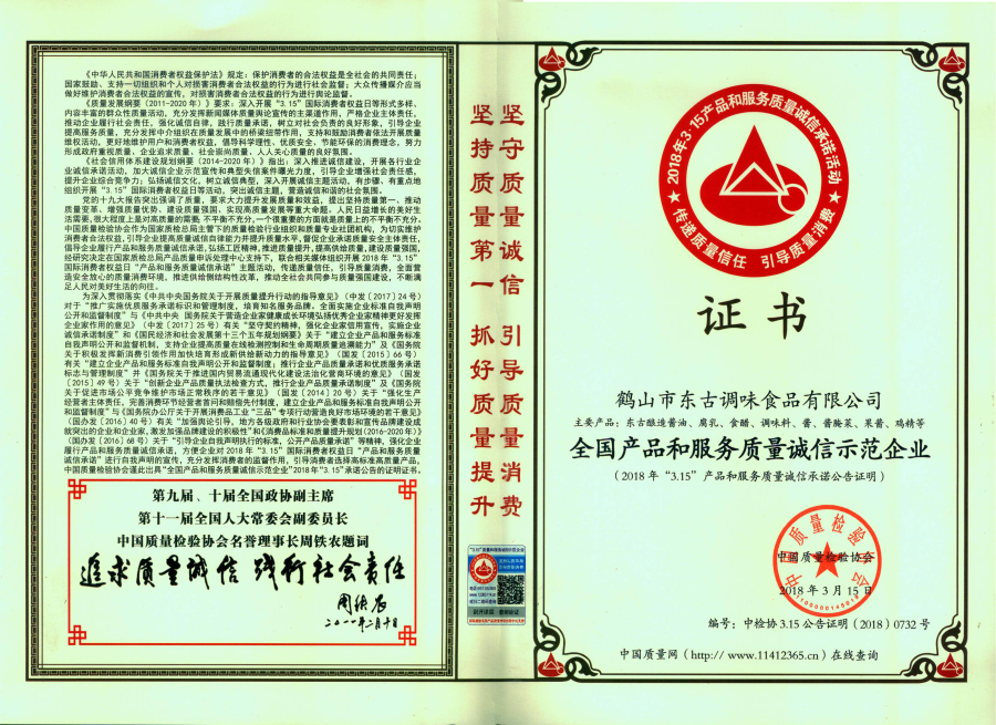 2018年315全國(guó)產(chǎn)品和服務(wù)質(zhì)量誠(chéng)信示范企業(yè)