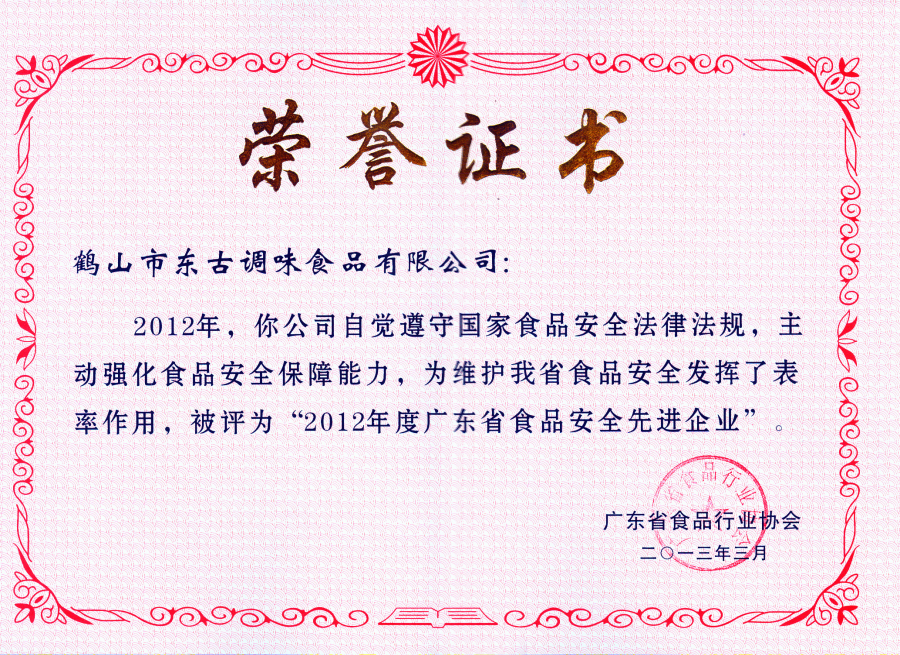 2012年度廣東省食品安全先進(jìn)企業(yè)證書