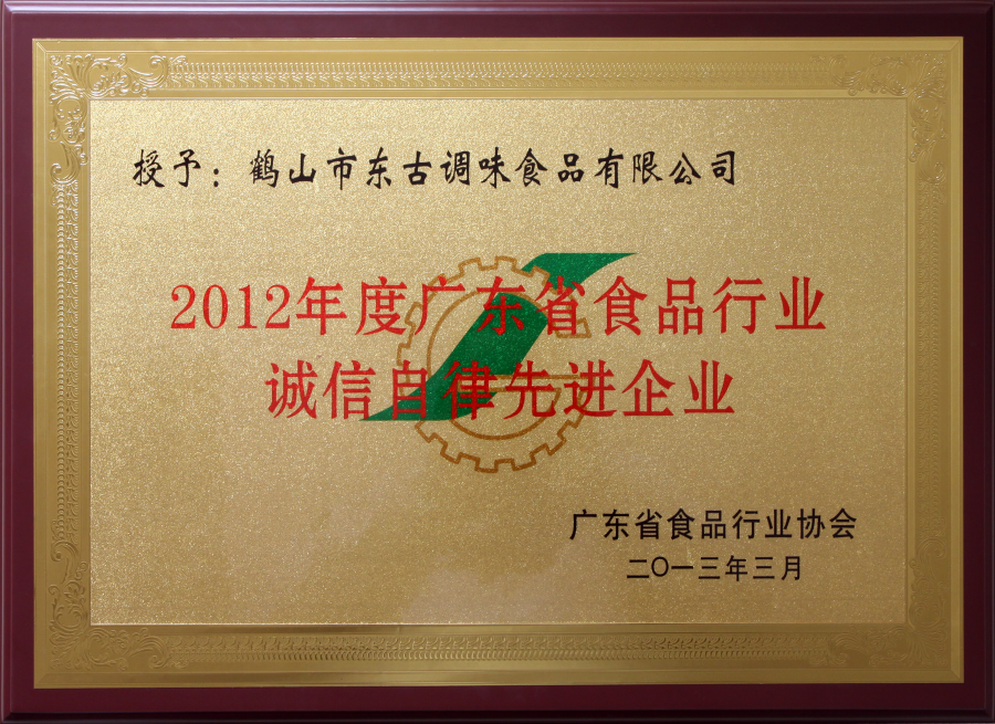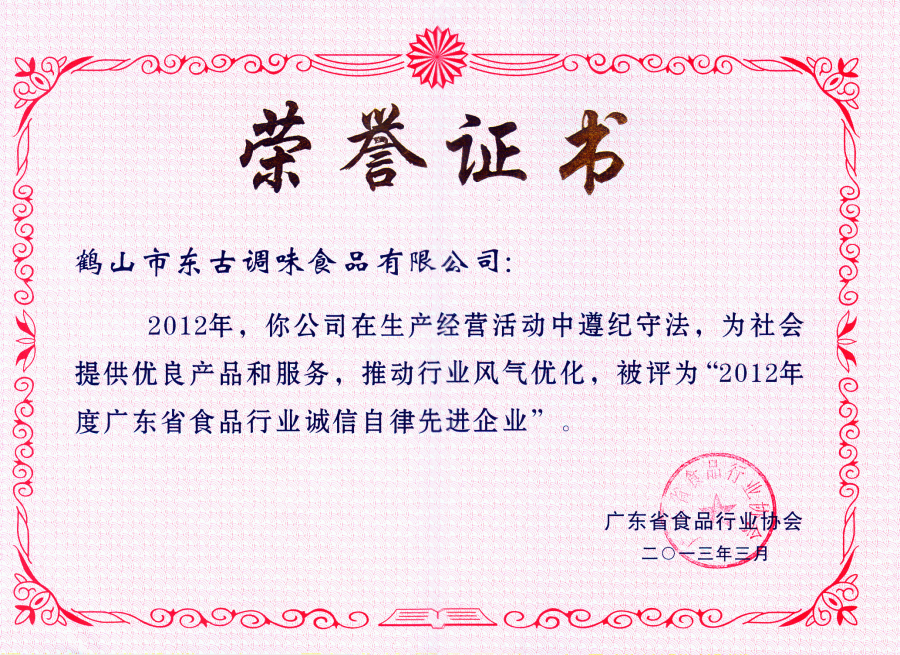 2012年度廣東省食品行業(yè)誠信自律先進(jìn)企業(yè)證書