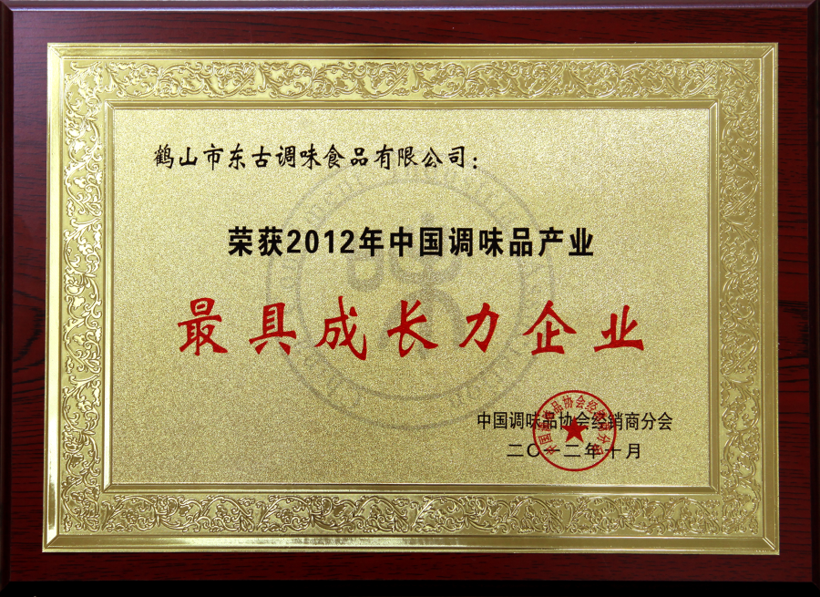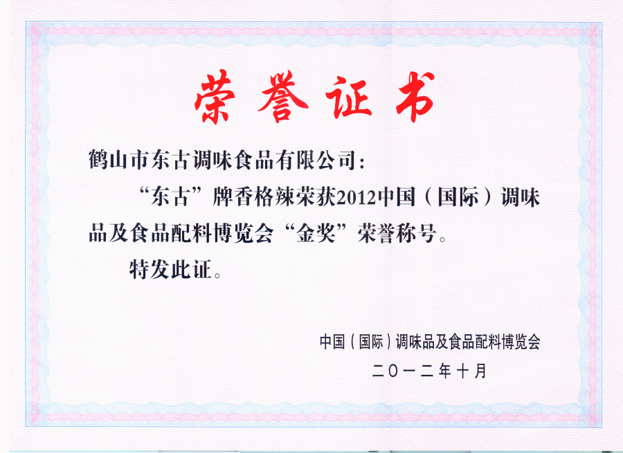 2012香格辣調(diào)味品及食品配料博覽會(huì)金獎(jiǎng)證書